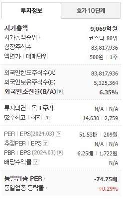 10,000원 부근이 주요 지지선으로 작용할 가능성이 크고, 14,630원에서 15,000원 사이가 강한 저항선으로 작용할 수 있습니다. 주가는 최근 강한 상승세를 보이고 있으며, 단기 이동평균선이 장기 이동평균선을 상향 돌파하는 골든 크로스가 발생하였습니다. 현재 과매수 상태에 접근하고 있어 단기적인 조정 가능성이 있지만, MACD선이 신호선을 상향 돌파하는 긍정적인 신호를 보이고 있습니다.