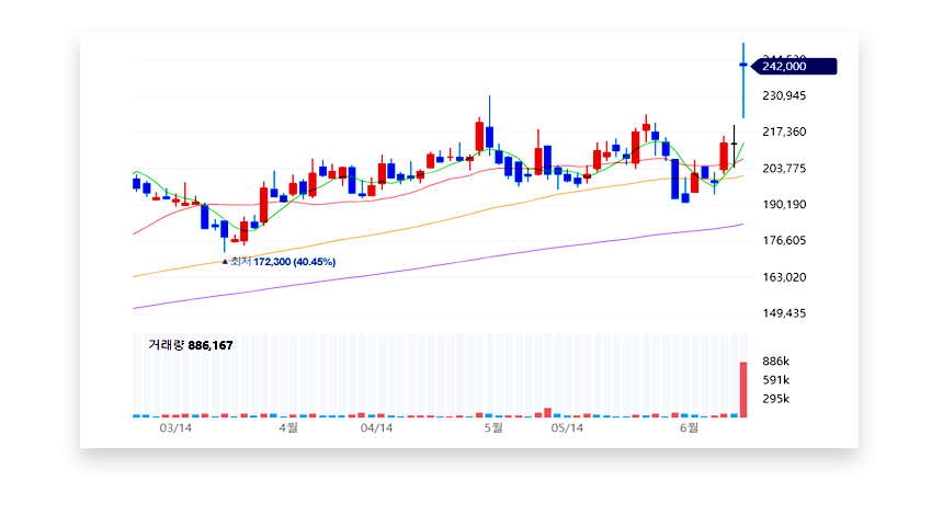 • 24년 6월 11일 기준 주가는 147,100원에서 급격히 상승하여 최고 262,500원까지 도달한 후 242,000원에 종가 마감되었습니다. 주가 상승과 함께 거래량이 크게 증가하였으며, 이날 매수세가 기관에서 강하게 유입되었습니다.