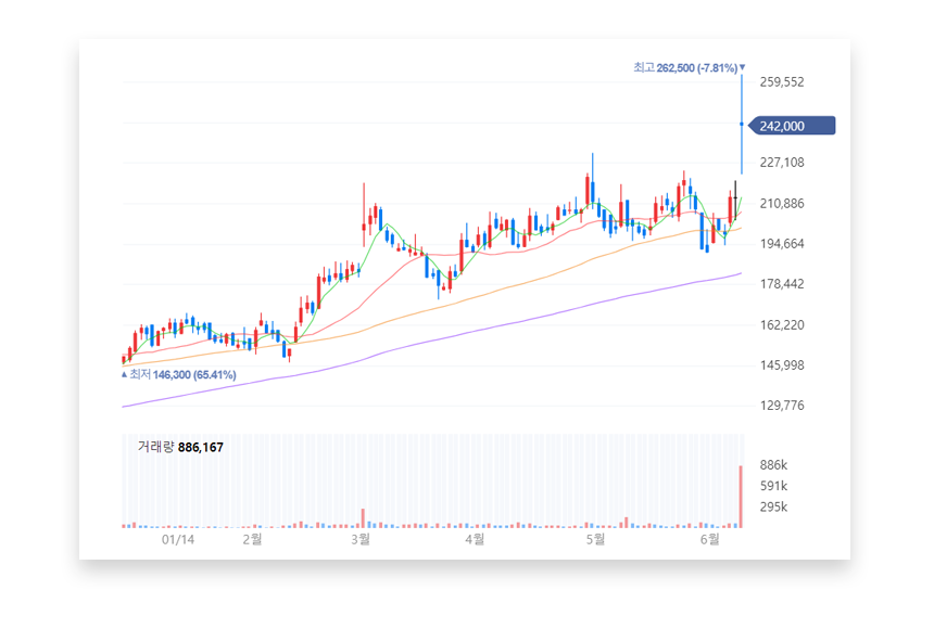 - 24년 6월 11일 기준 주가는 147,100원에서 급격히 상승하여 최고 262,500원까지 도달한 후 242,000원에 종가 마감되었습니다. 주가 상승과 함께 거래량이 크게 증가하였으며, 이날 매수세가 기관에서 강하게 유입되었습니다.
