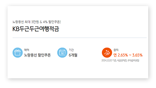 KB두근두근여행적금은 여행 준비와 적금 혜택을 동시에 누릴 수 있는 특별한 상품입니다. 노랑풍선 여행 할인 쿠폰으로 더 큰 혜택을 제공하며, 짧은 기간 동안 효율적으로 저축할 수 있는 옵션을 제공합니다.