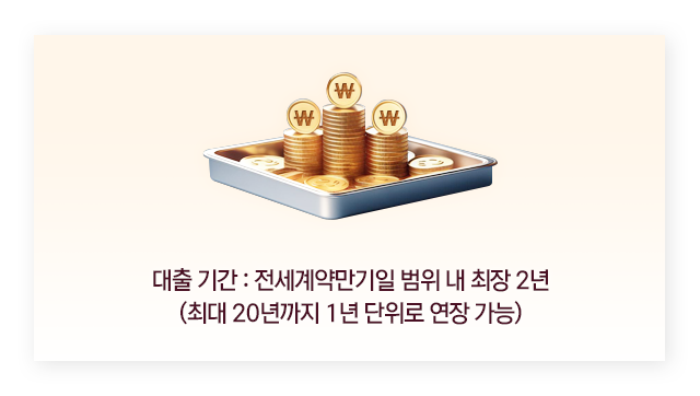 - 대출 기간: 전세계약 만기일까지 (최장 2년), 최대 20년까지 연장 가능