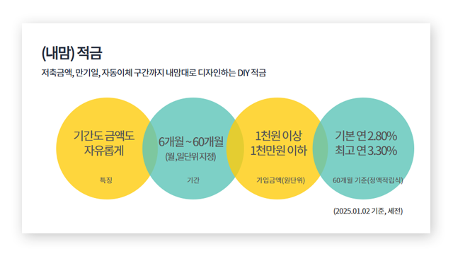 내맘 적금은 저축 금액, 만기일, 자동이체 주기 등을 고객이 자유롭게 설정할 수 있는 하나은행의 DIY 적금 상품입니다.