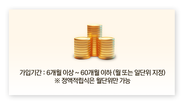 - 가입 기간: 6개월 이상 ~ 60개월 이하 (월 또는 일 단위 지정 가능)