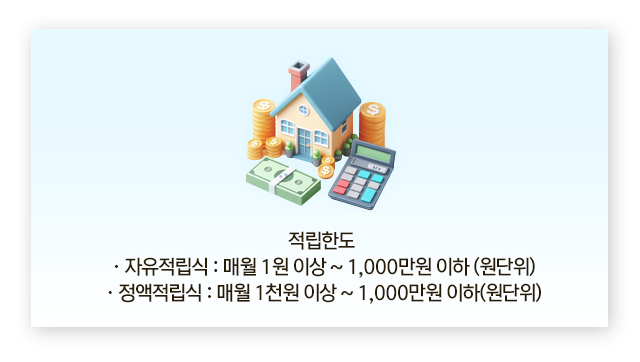 - 정액적립식: 매월 1천 원 이상 ~ 1천만 원 이하