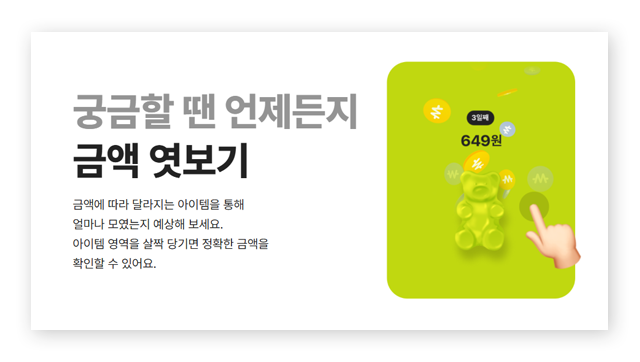 - 금액 엿보기: 잔액을 간단히 확인하며 저축 상태를 직관적으로 파악