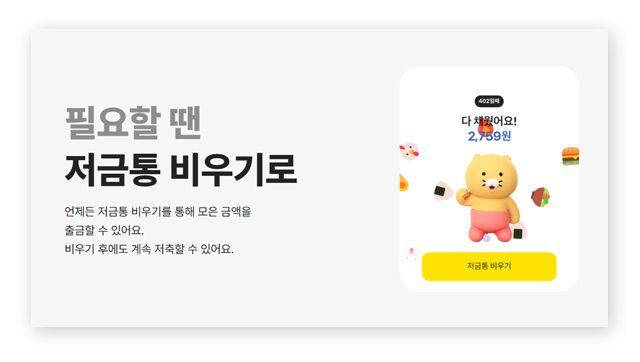 - 저금통 비우기: 언제든 필요한 시점에 원금 및 이자를 연결된 입출금통장으로 출금