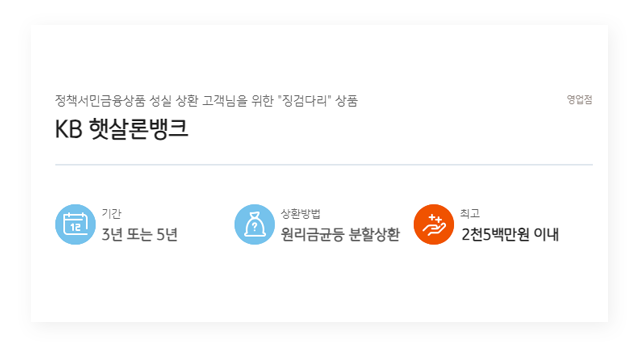 KB 햇살론뱅크는 정책 서민금융상품을 성실히 상환한 고객을 위한 대출 상품입니다. 신용 개선 및 부채 감소를 이룬 고객에게 금융권 재진입의 기회를 제공합니다.