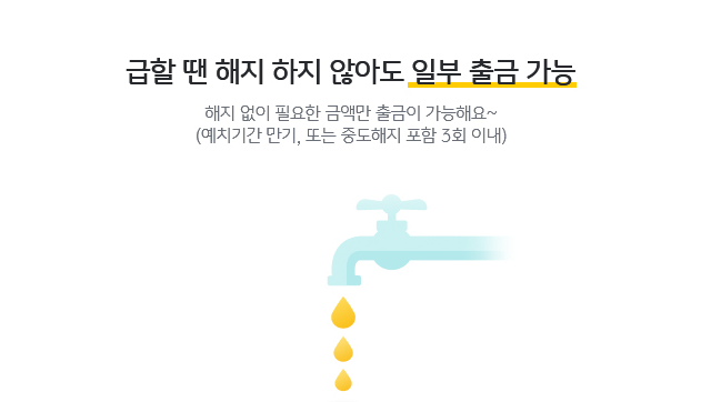 긴급 상황 발생 시 일부 금액만 인출하여 잔액을 유지하며 예금을 지속할 수 있어, 유동성과 안정성을 동시에 제공합니다.