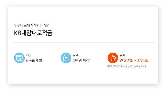 여러 가지 선택 옵션과 부가 혜택이 결합된 KB 내맘대로 적금은 고객의 라이프스타일과 재테크 목표를 반영한 맞춤형 상품입니다. 지금 바로 KB스타뱅킹이나 인터넷뱅킹을 통해 가입해보세요!