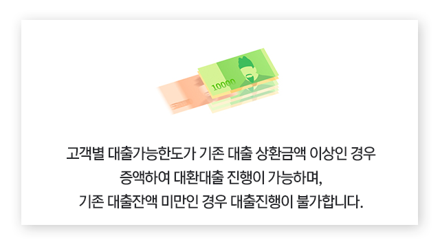 - 대환 조건 충족 필요: 고객의 대출 가능 한도가 기존 대출 상환 금액 이상이어야 대환 진행 가능