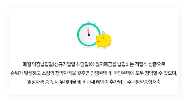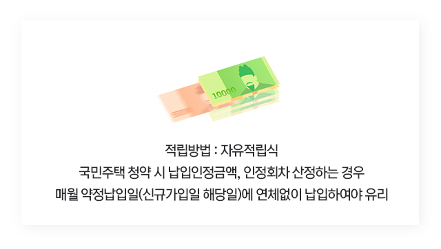 - 청약자격: 납입 회차와 금액에 따라 순위가 결정되며, 국민주택 및 민영주택 모두 청약 가능