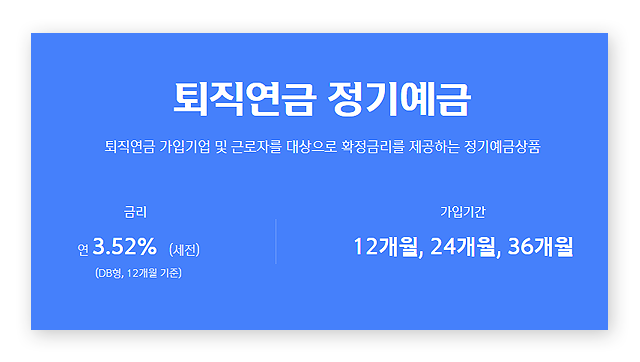 퇴직연금 정기예금은 퇴직연금 가입기업 및 근로자를 대상으로 제공되는 확정금리 상품으로, 퇴직급여 자산을 안정적으로 운용할 수 있는 금융상품입니다. DB형, DC형, IRP형에 따라 다양한 조건을 제공하며, 세제혜택과 더불어 안전한 자금 운용을 지원합니다.