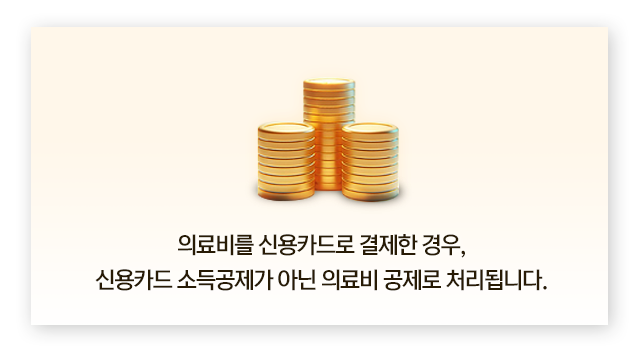 - 의료비 공제: 의료비를 신용카드로 결제한 경우, 신용카드 소득공제가 아닌 의료비 공제로 처리됩니다.